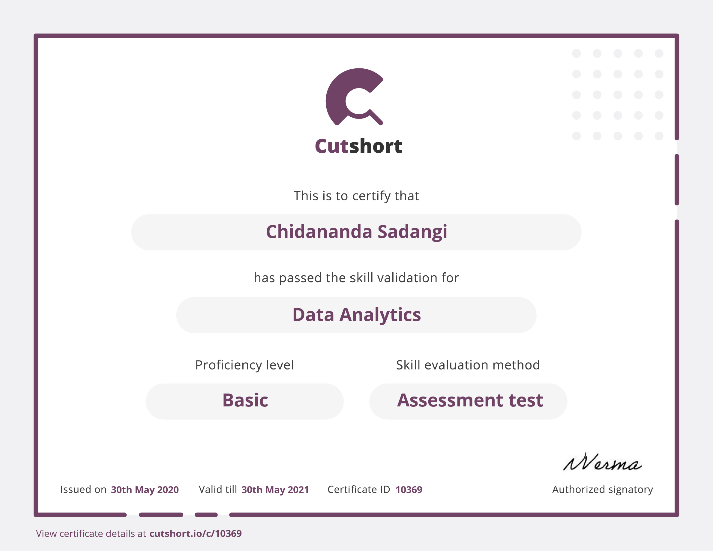 Presented to Chidananda for Basic proficiency in Data Analytics