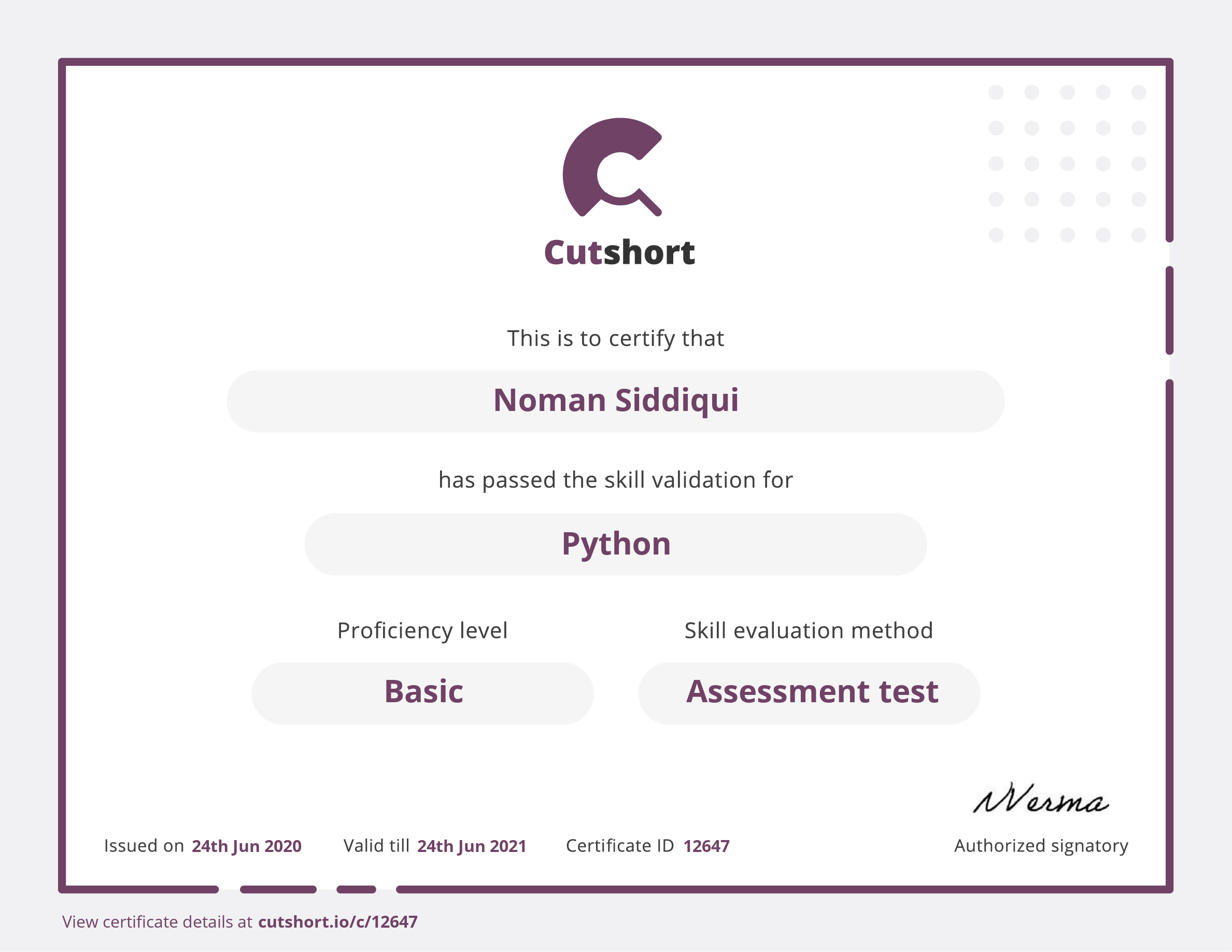 Cutshort skill certificate