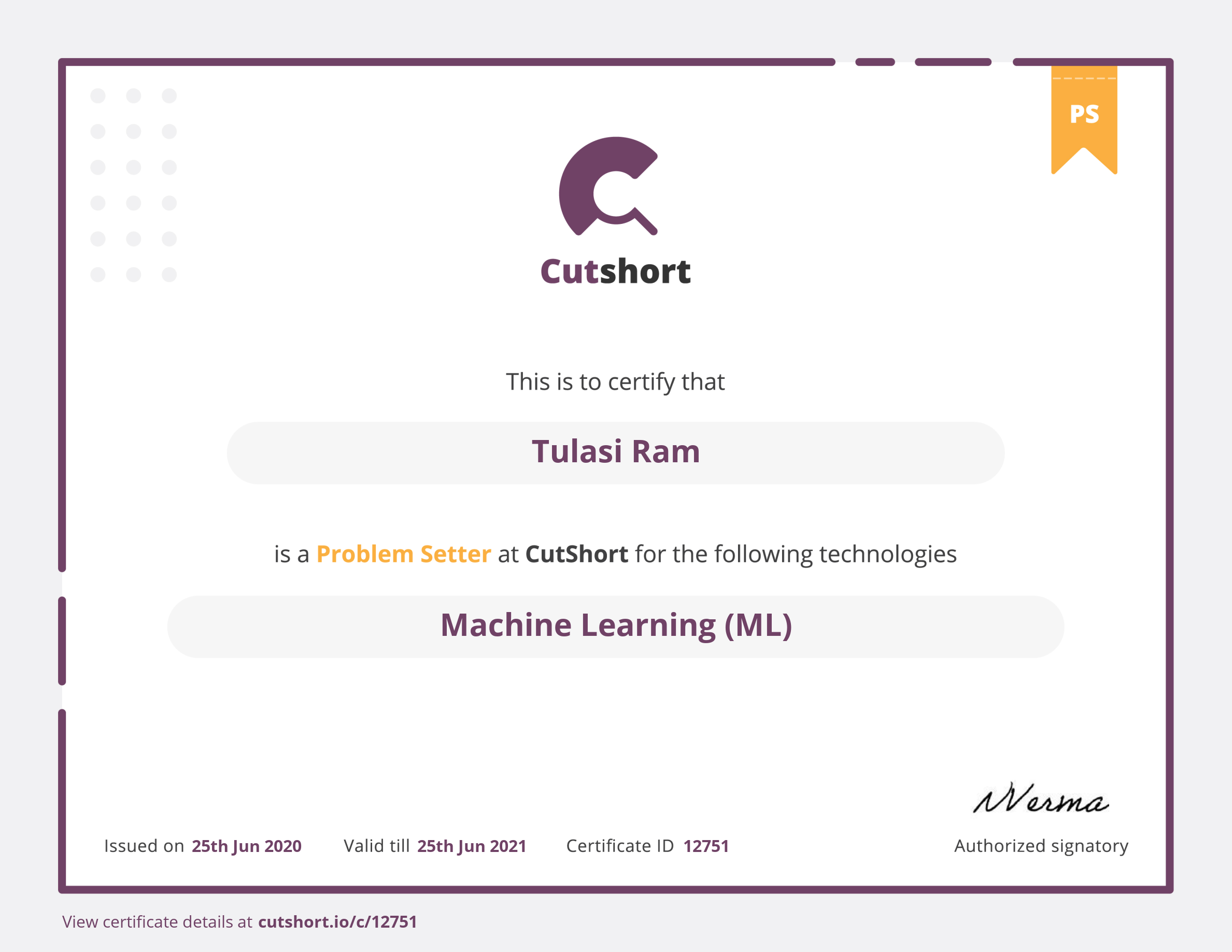 Cutshort problem setter certificate