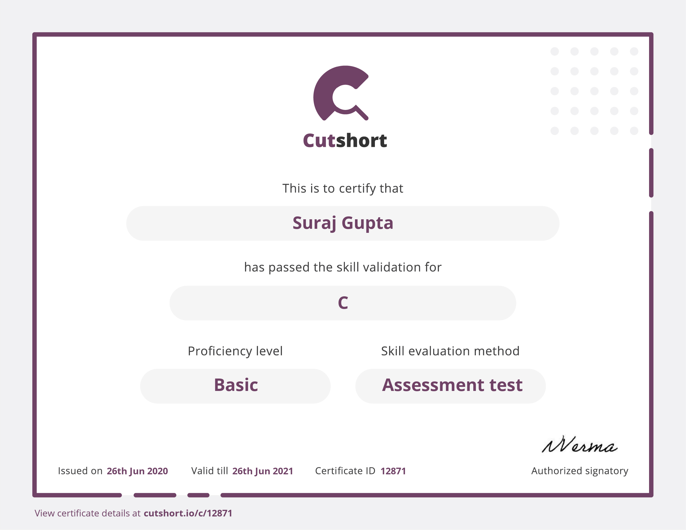 Cutshort skill certificate