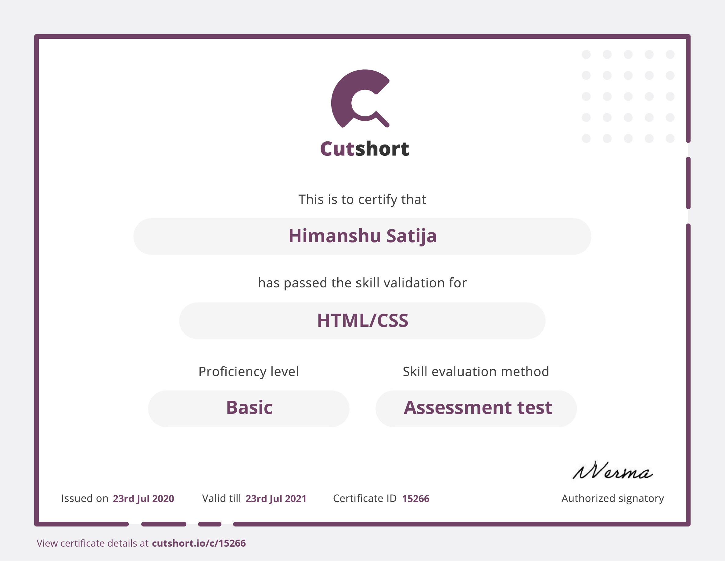 Presented to Himanshu for Basic proficiency in HTML/CSS