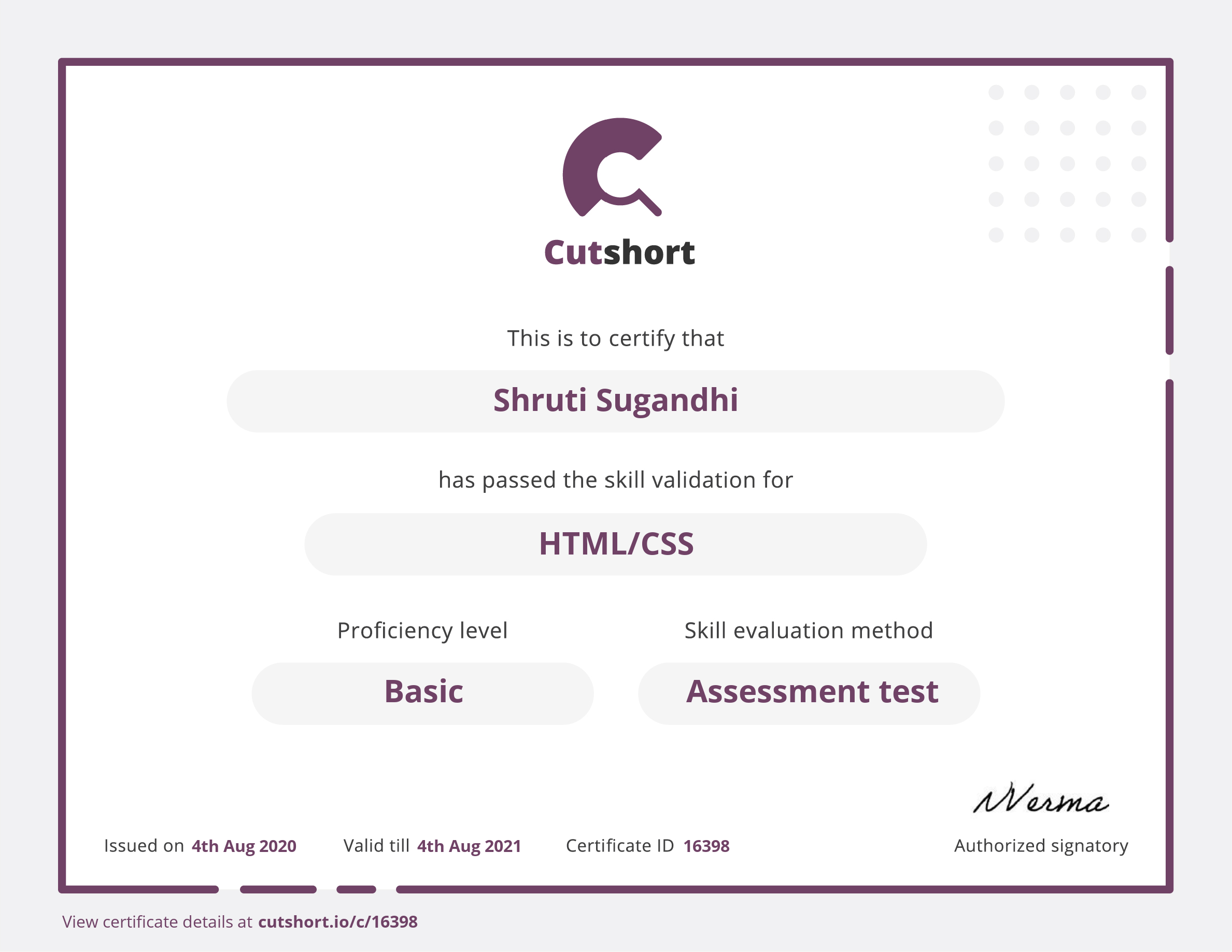 Cutshort skill certificate
