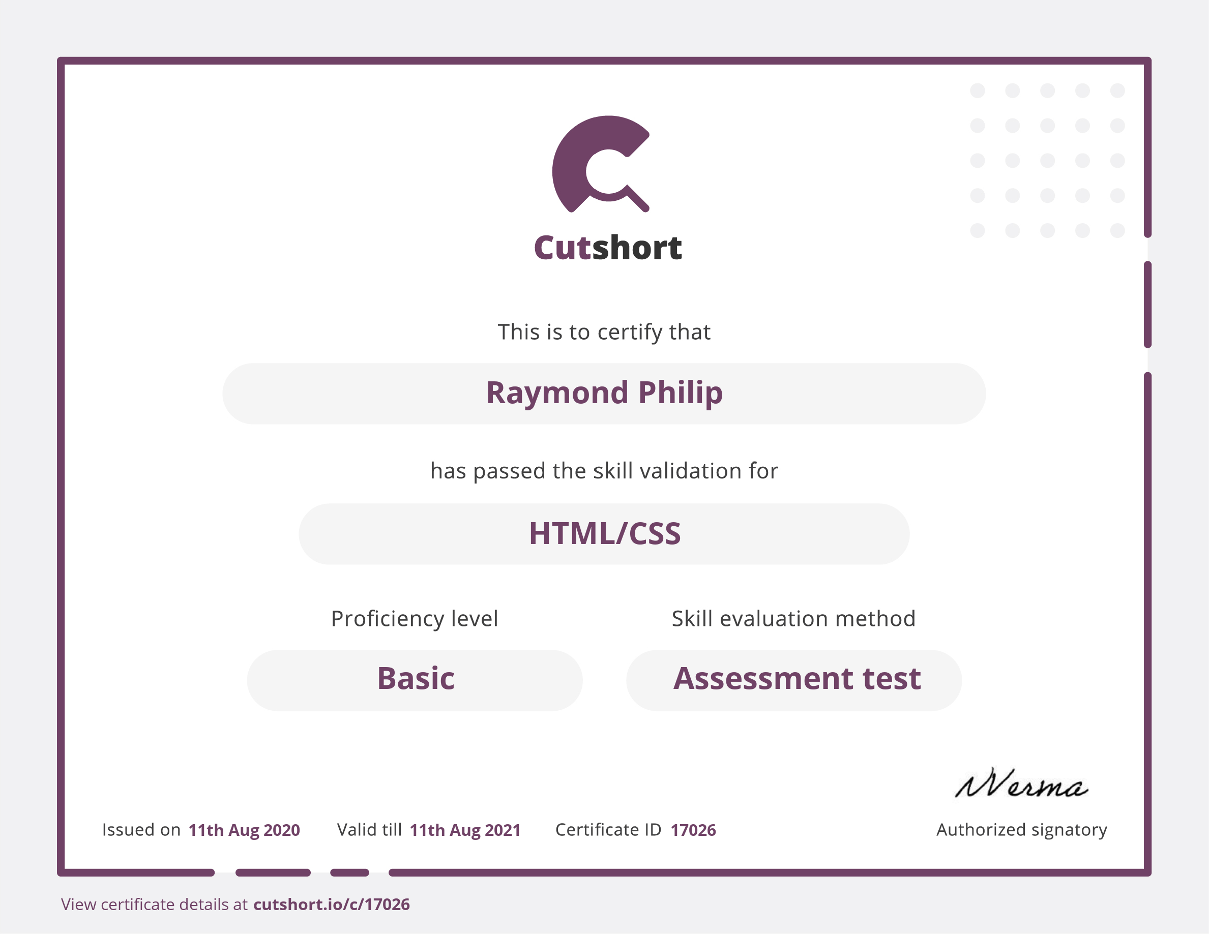 Presented to Raymond for Basic proficiency in HTML/CSS