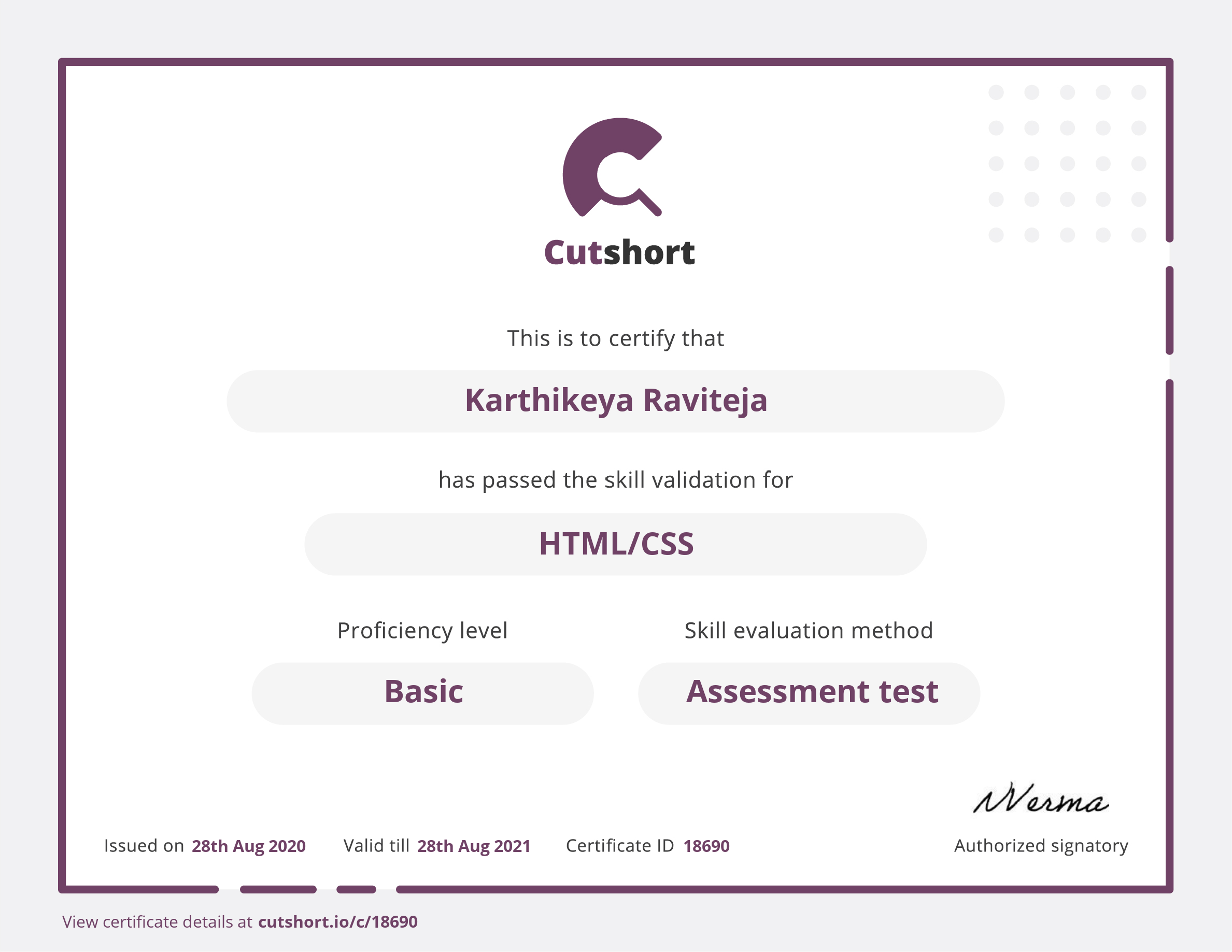 Presented to Karthikeya for Basic proficiency in HTML/CSS