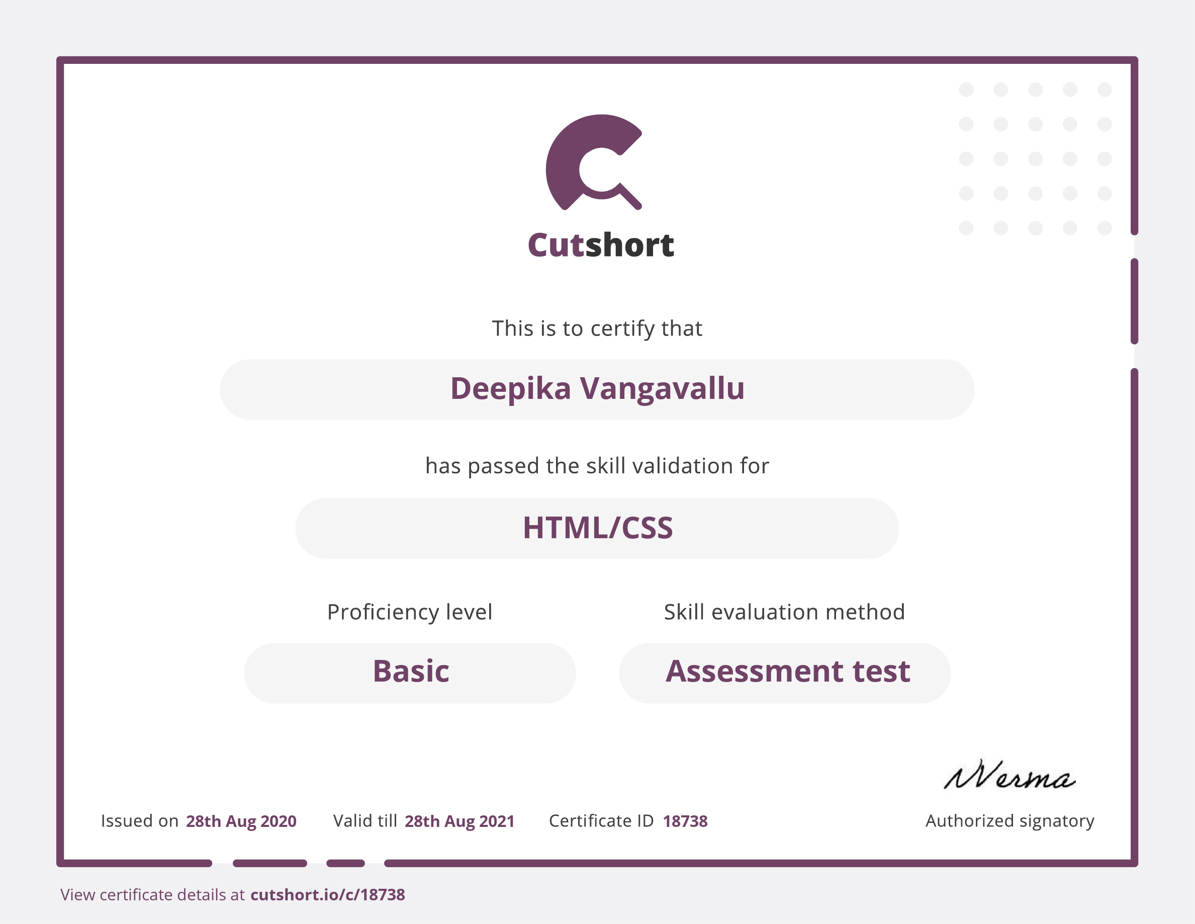 Presented to Deepika for Basic proficiency in HTML/CSS