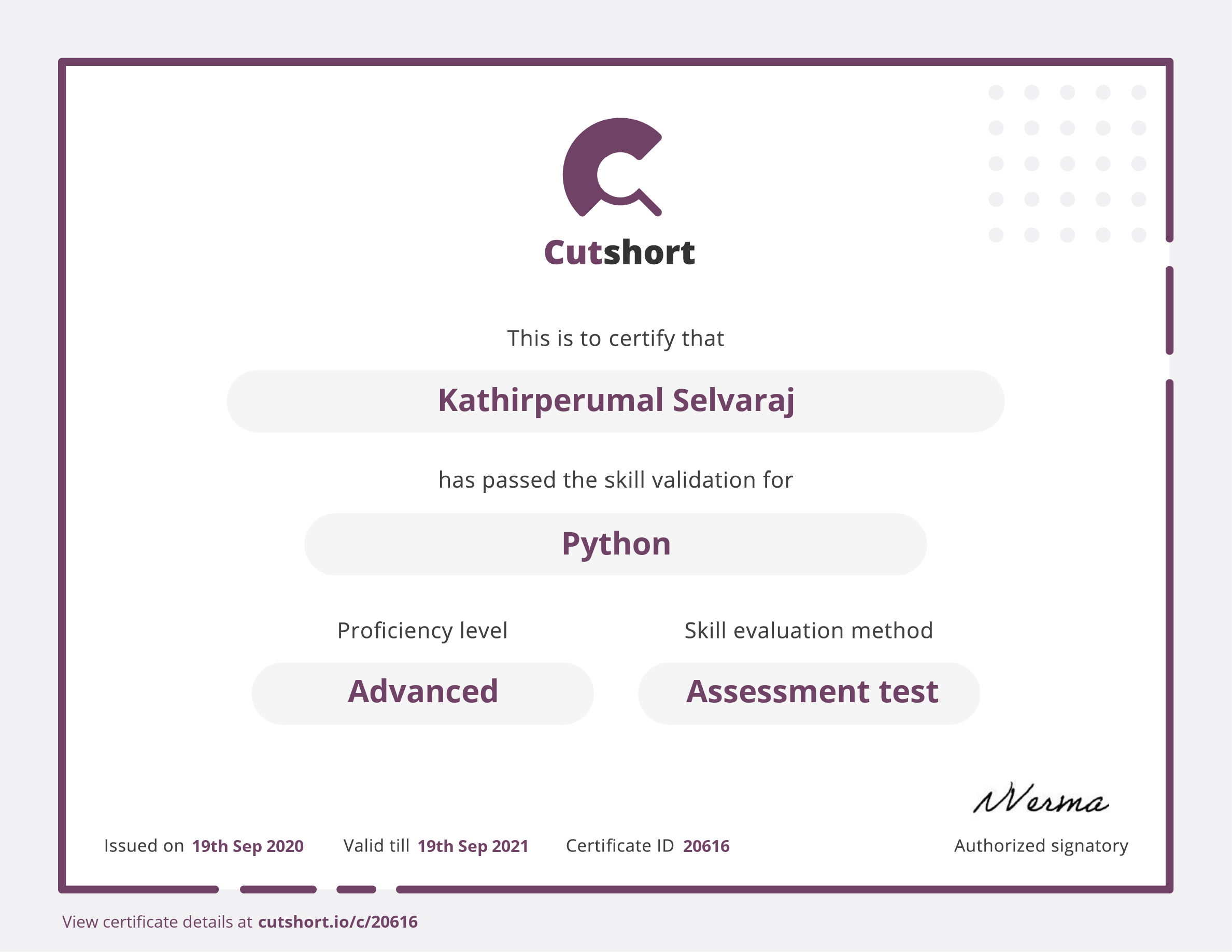 Presented to Kathirperumal for Advanced proficiency in Python