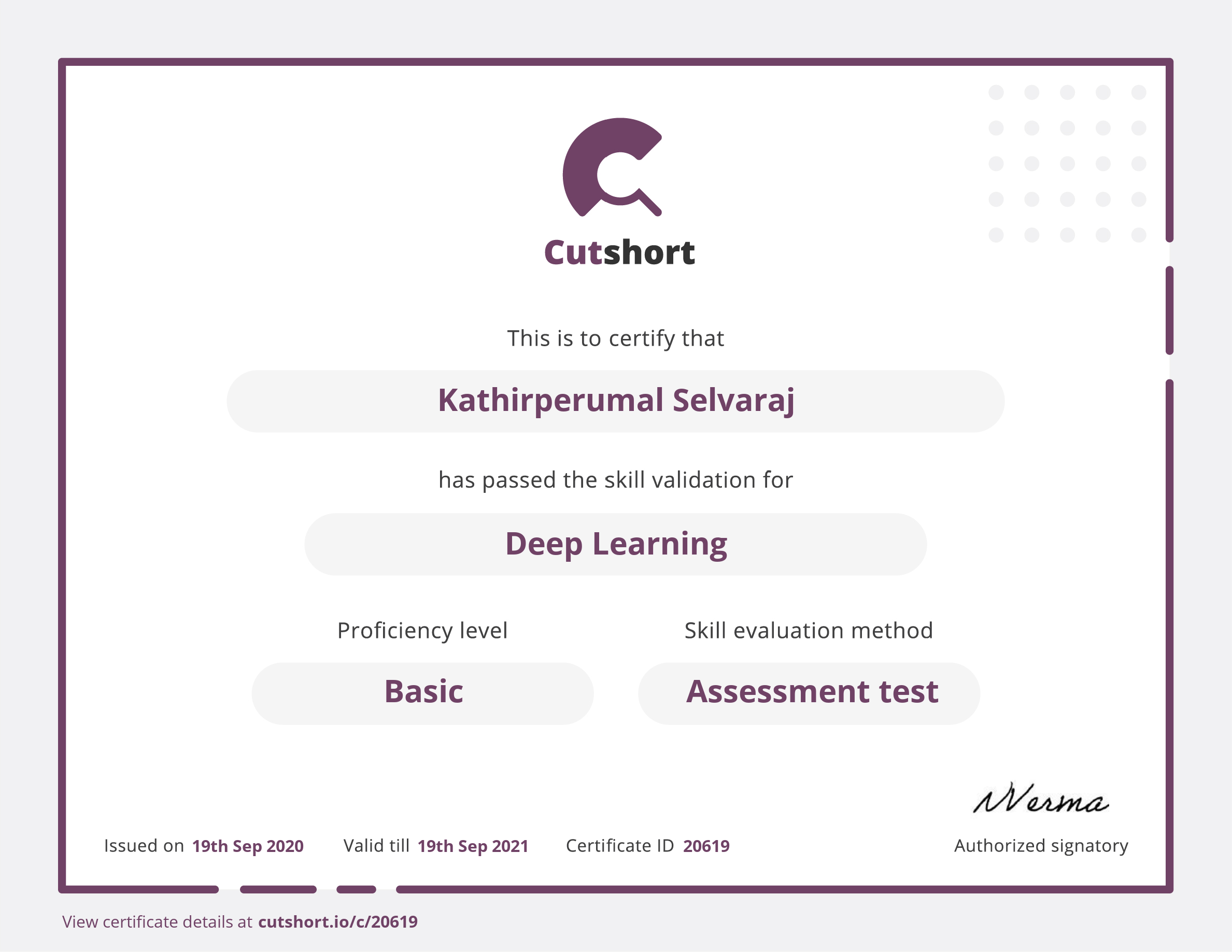 Presented to Kathirperumal for Basic proficiency in Deep Learning