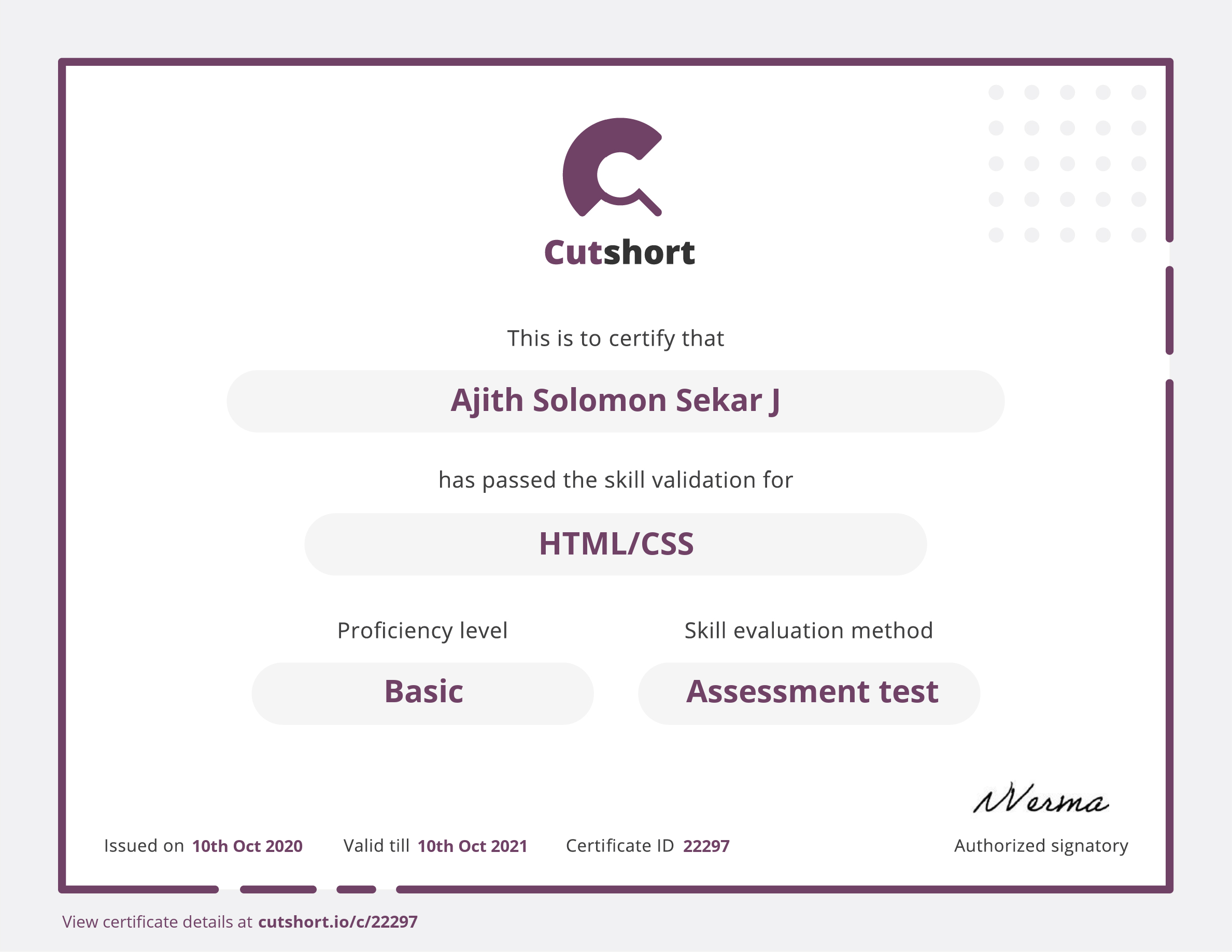Presented to AjithSolomonSekarJ for Basic proficiency in HTML/CSS