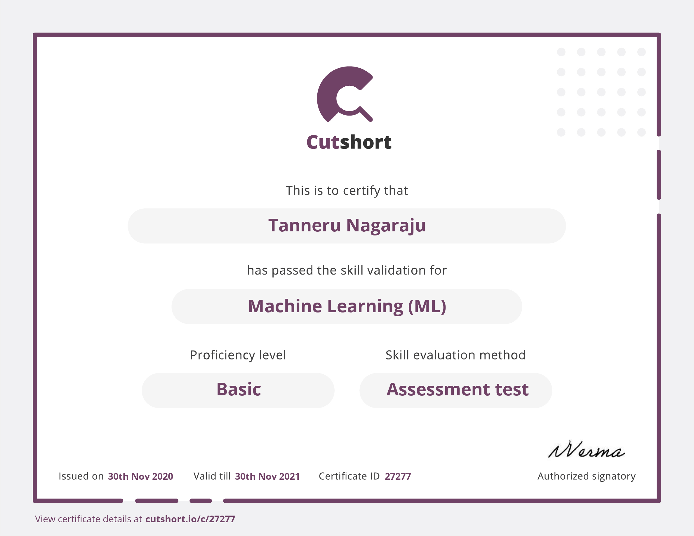 Presented to Tanneru for Basic proficiency in Machine Learning (ML)