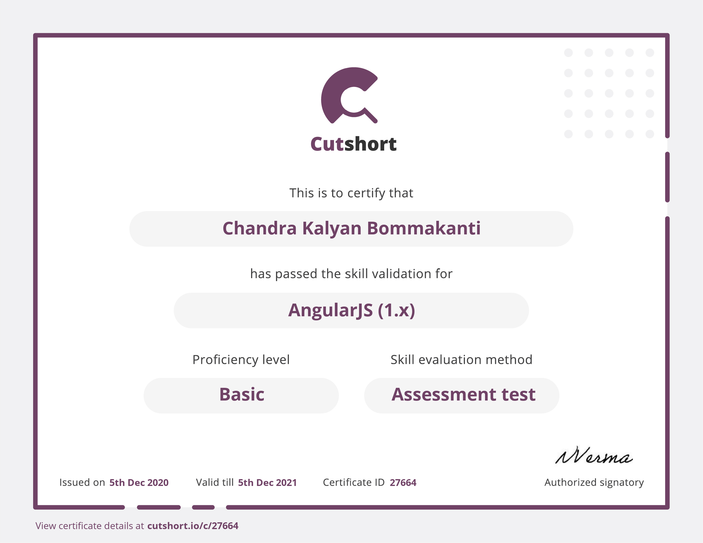 Presented to Chandra for Basic proficiency in AngularJS (1.x)