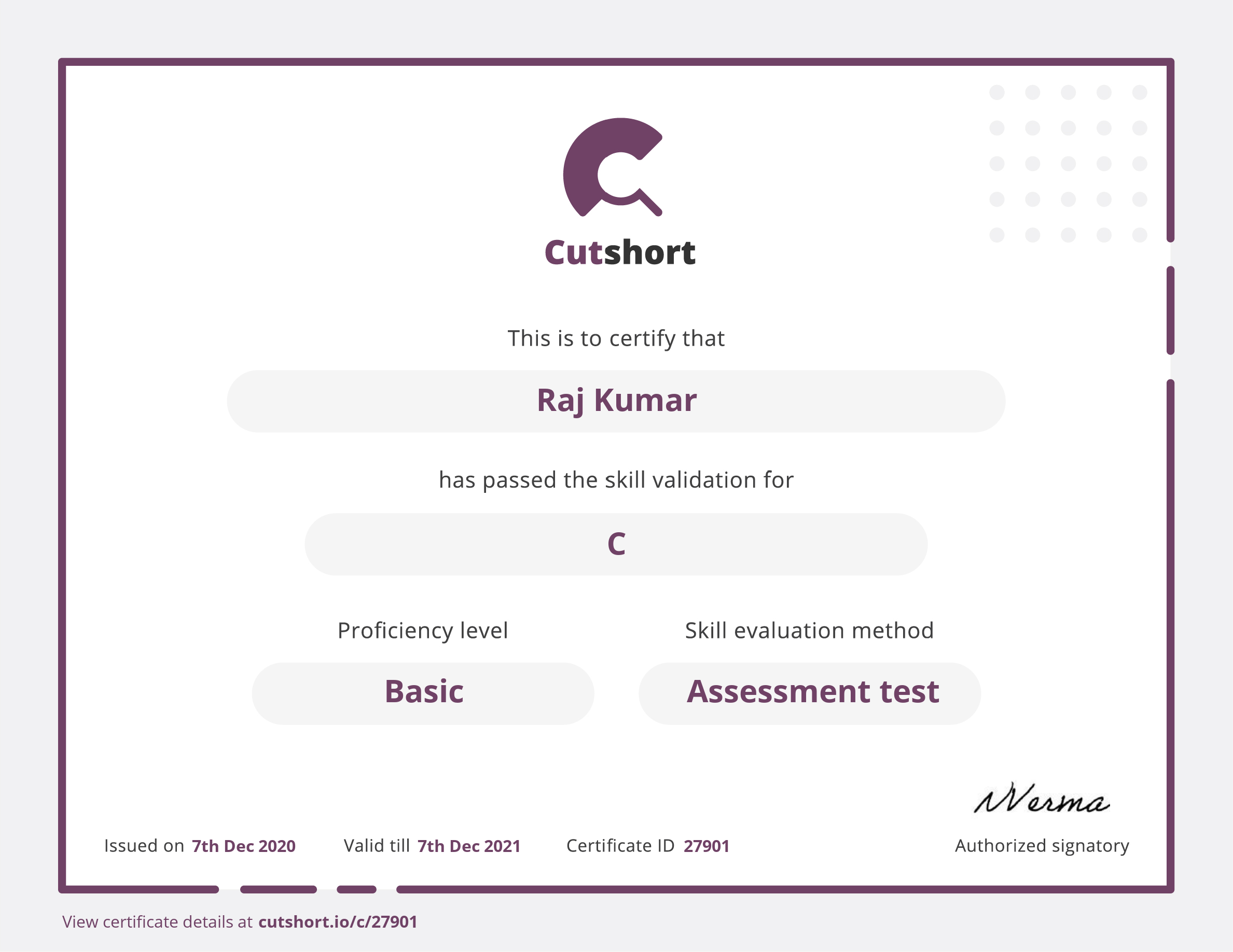 Presented to Raj for Basic proficiency in C