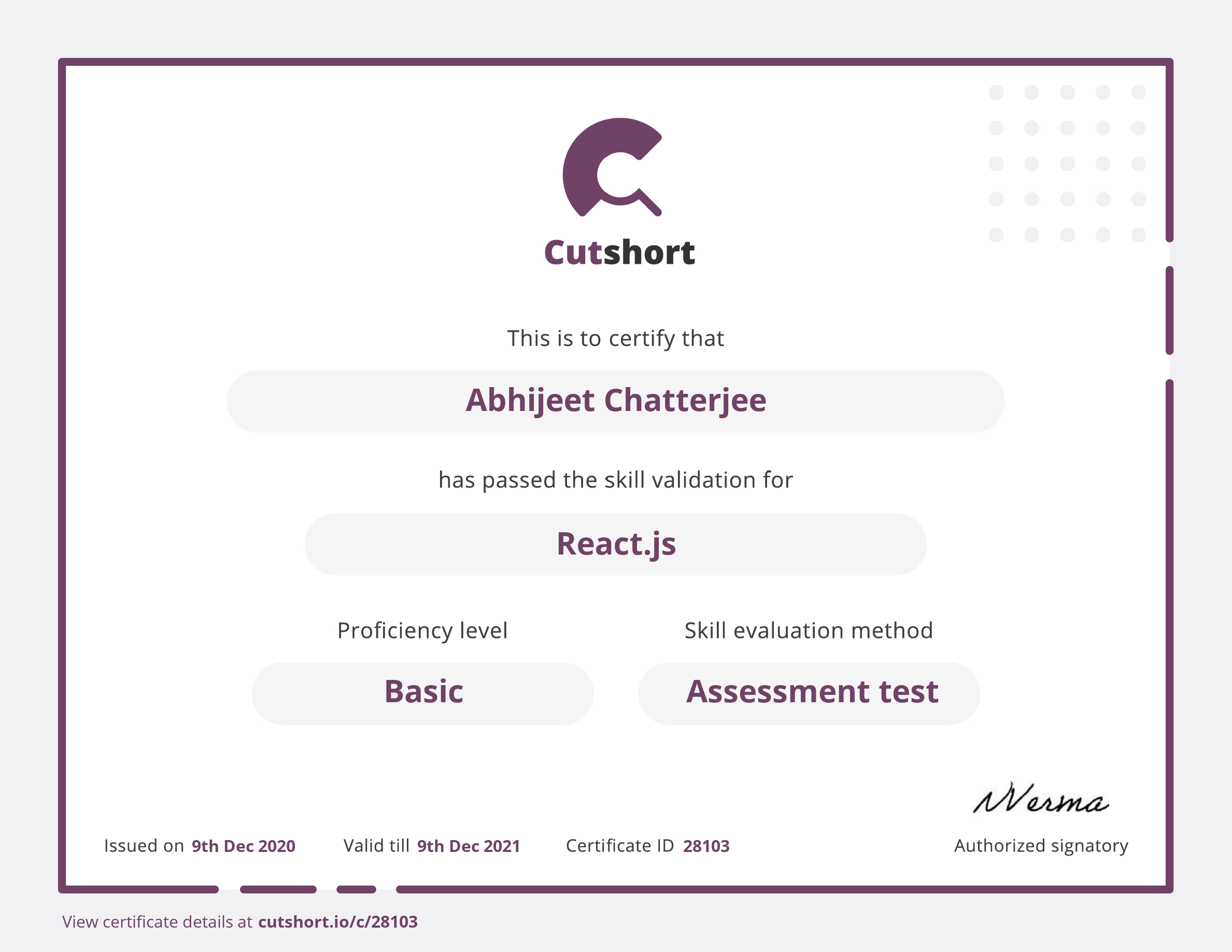 Presented to Abhijeet for Basic proficiency in React.js