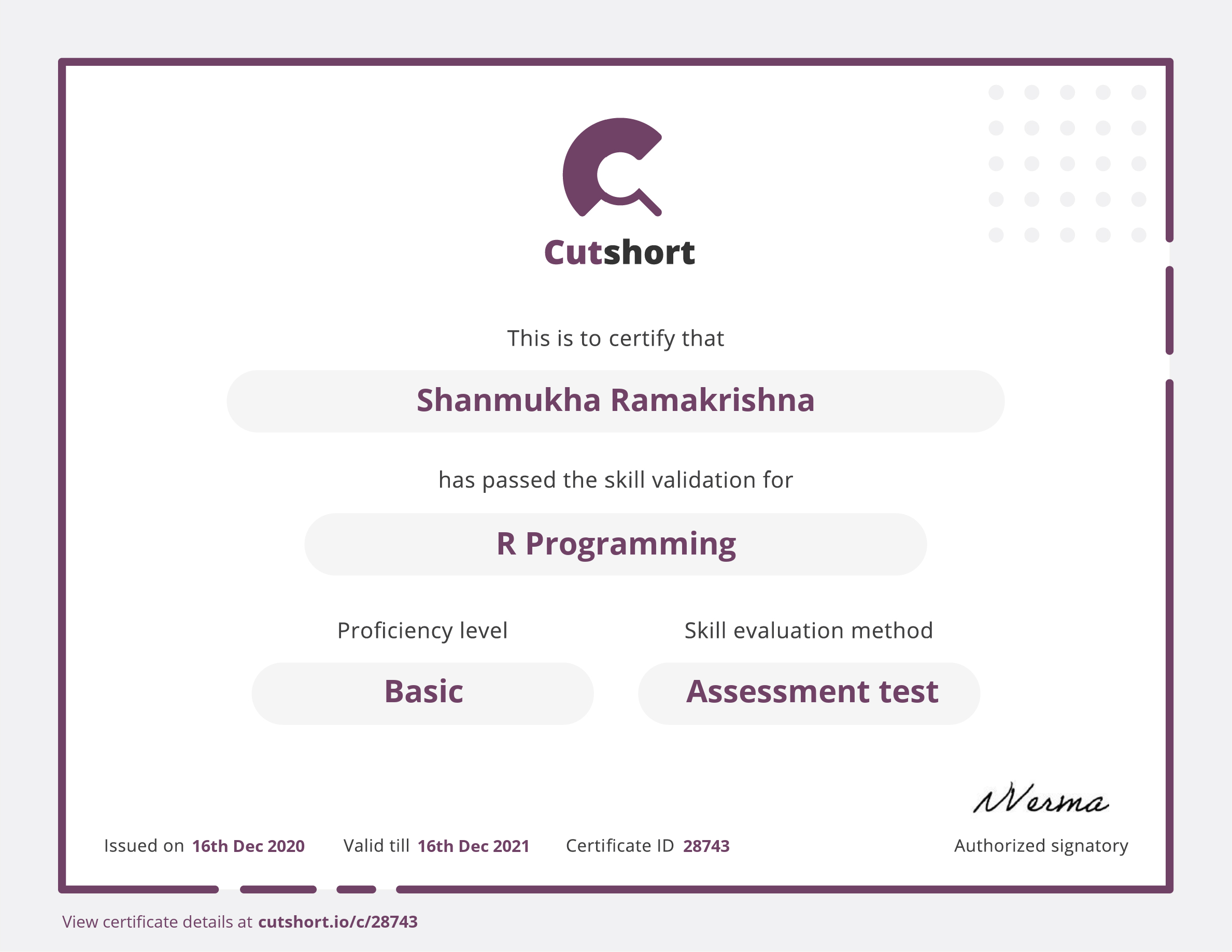 Presented to Shanmukha for Basic proficiency in R Programming