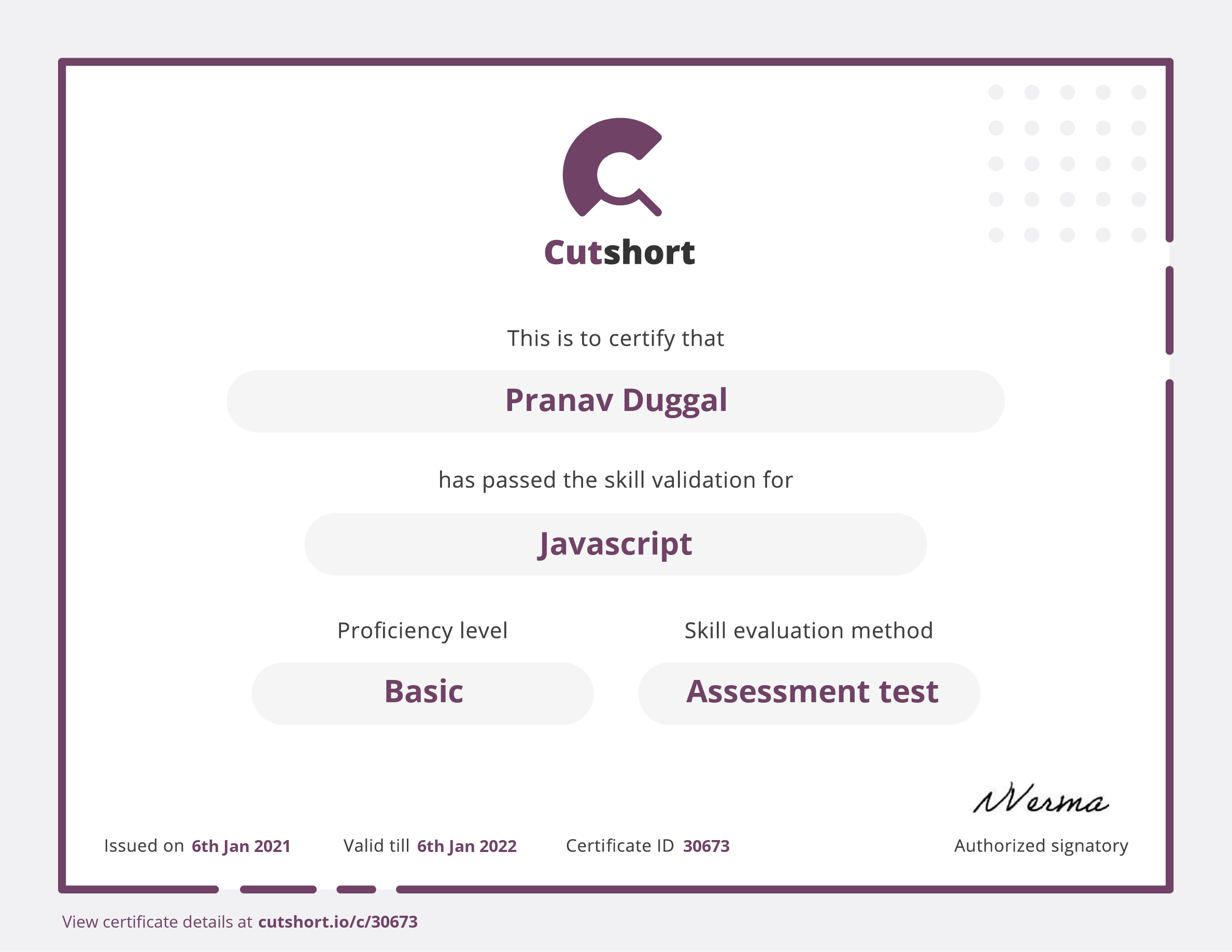 Cutshort skill certificate