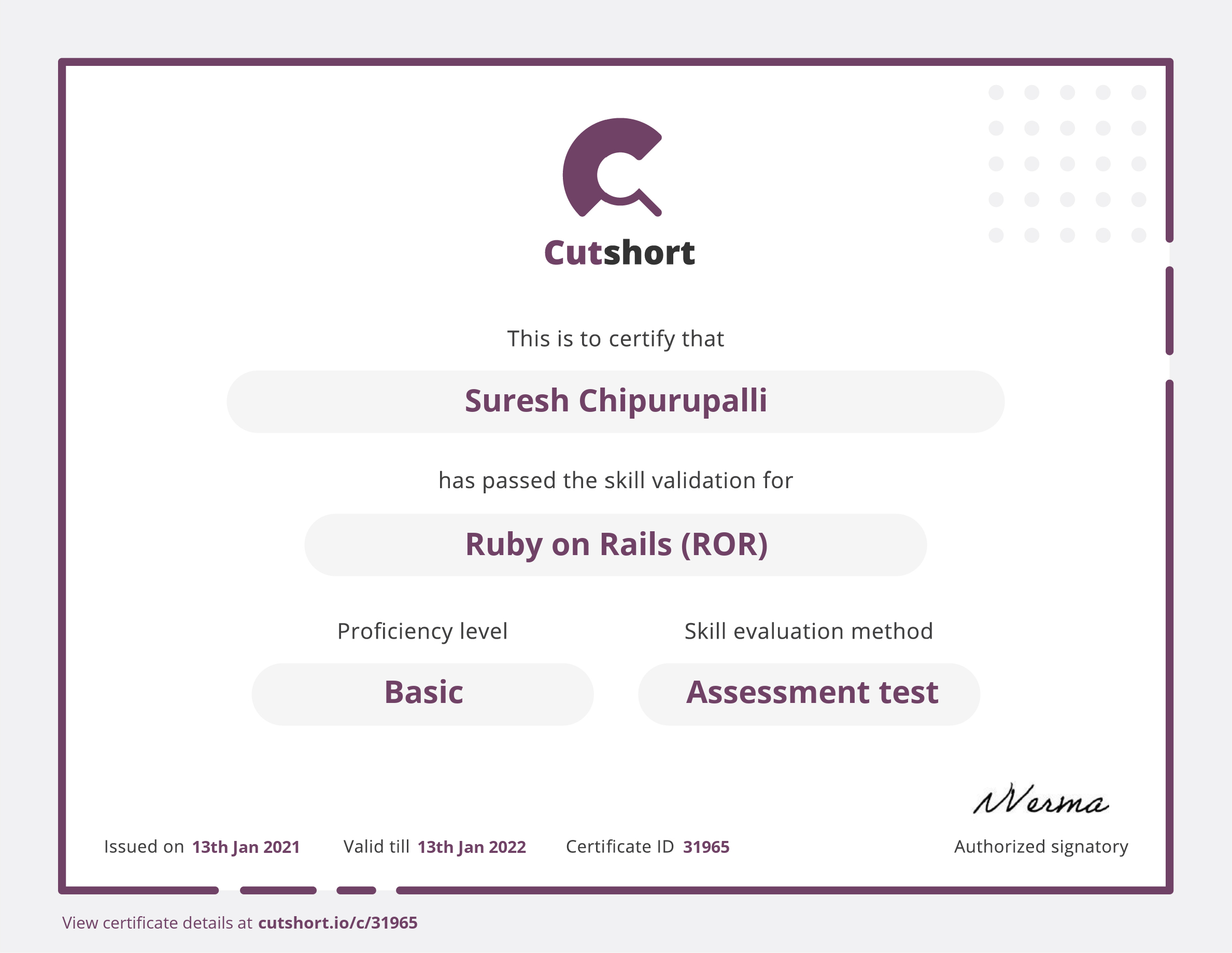 Presented to Suresh for Basic proficiency in Ruby on Rails (ROR)