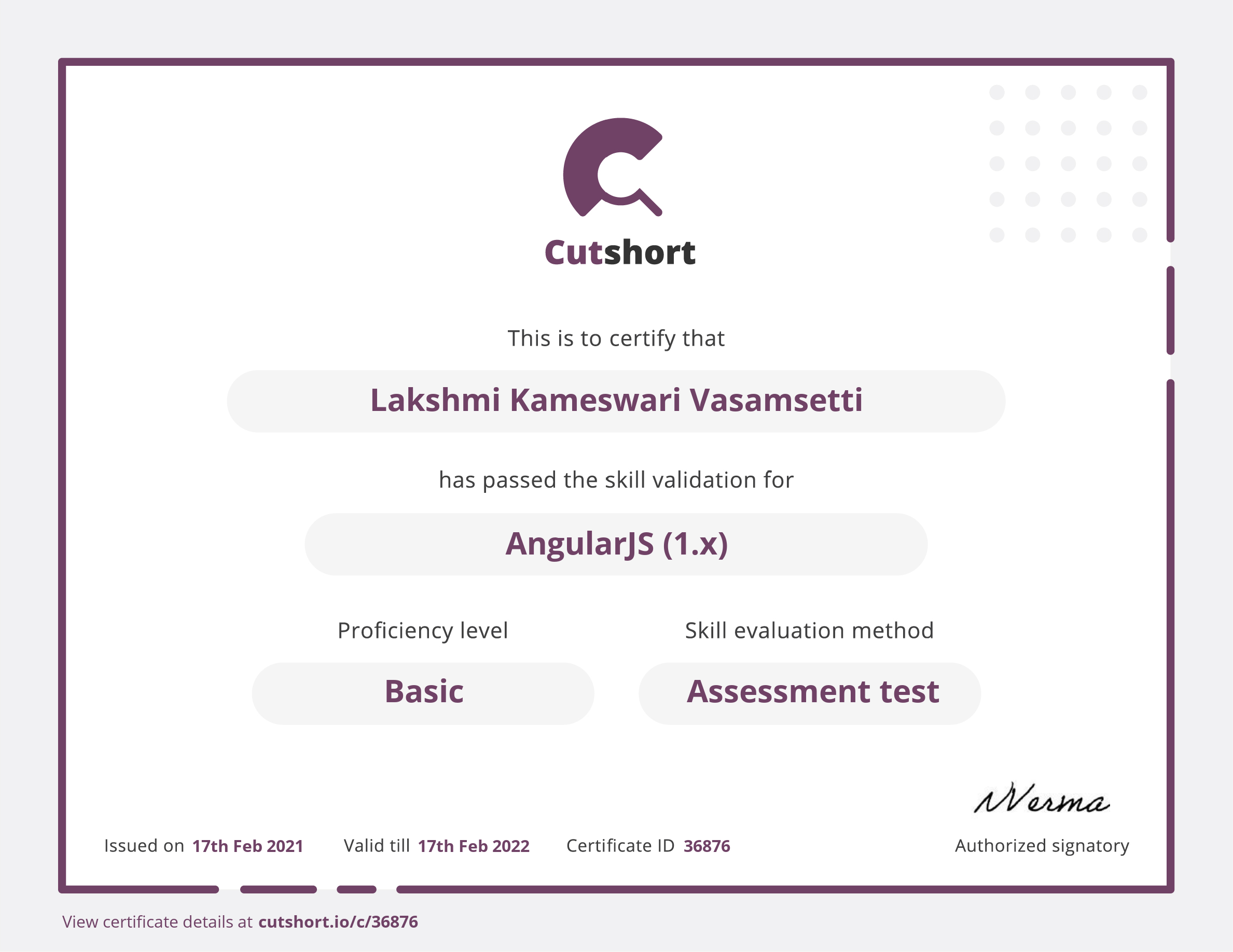 Presented to Lakshmi for Basic proficiency in AngularJS (1.x)