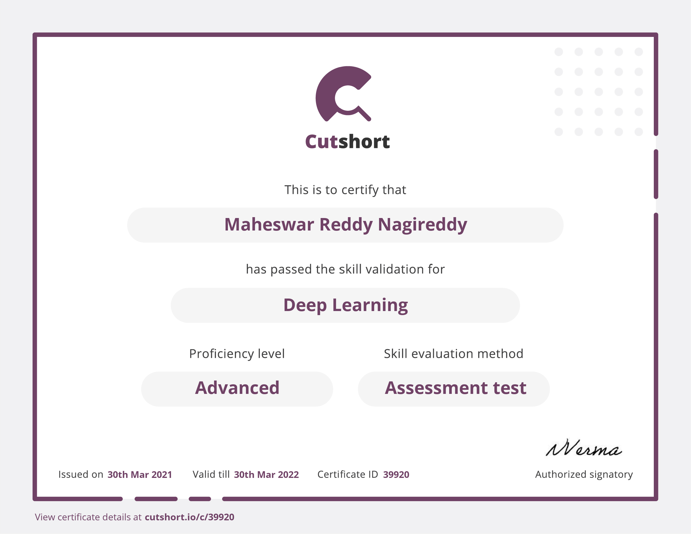 Presented to Maheswar for Advanced proficiency in Deep Learning