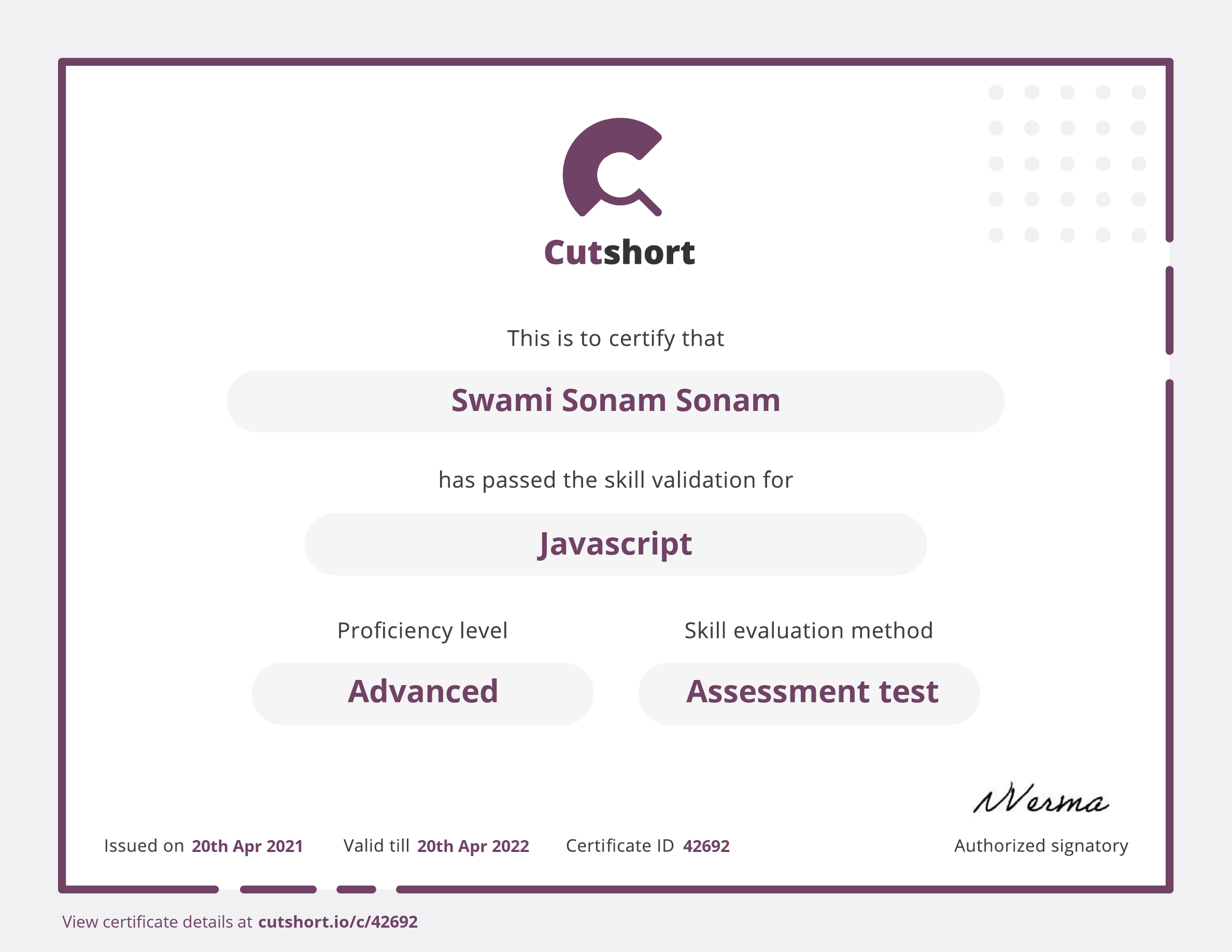Cutshort skill certificate