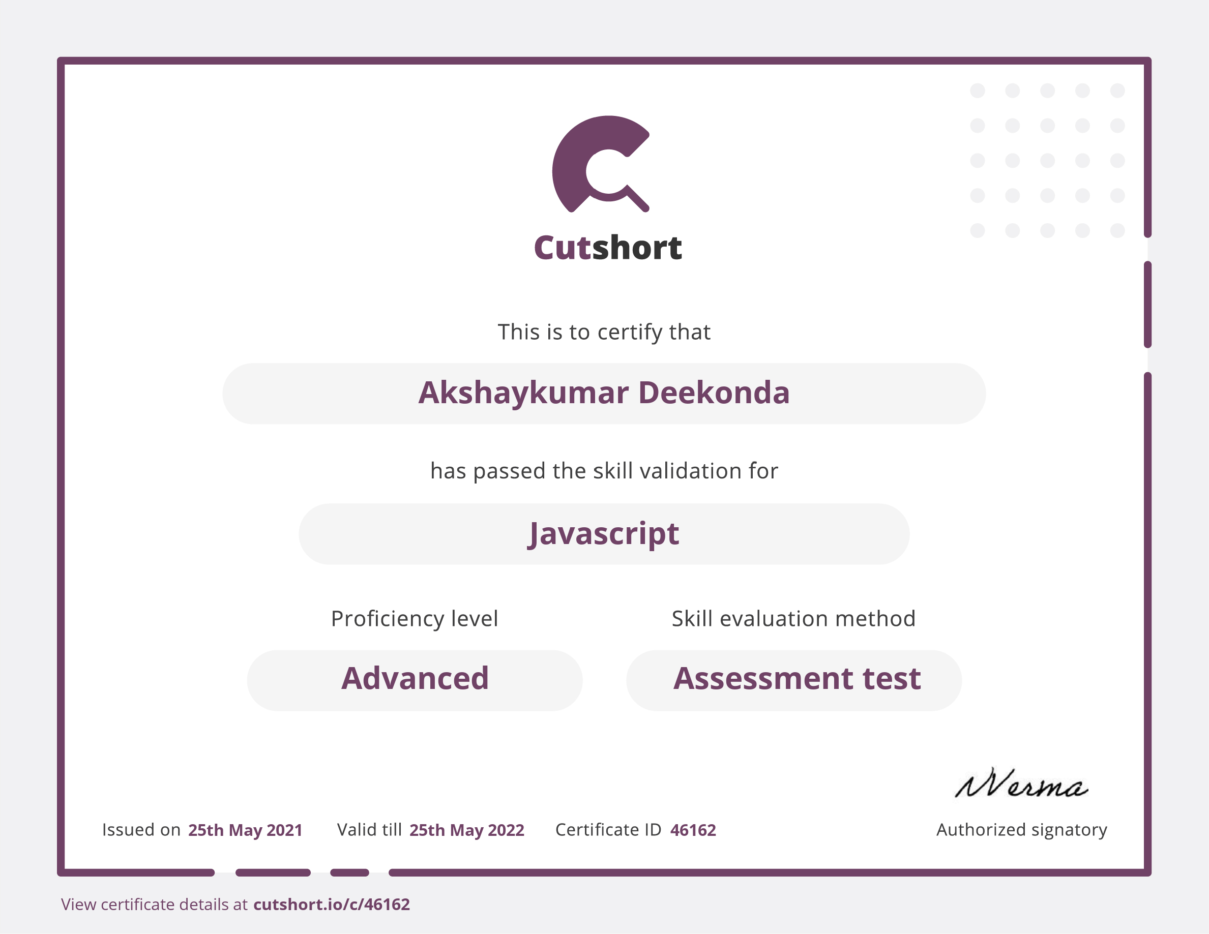 Cutshort skill certificate