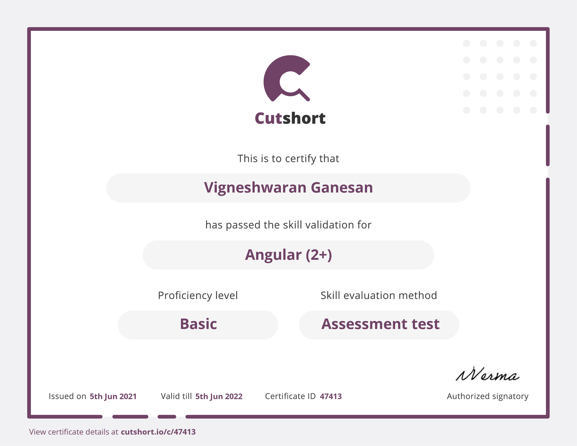 Presented to Vigneshwaran for Basic proficiency in Angular (2+)