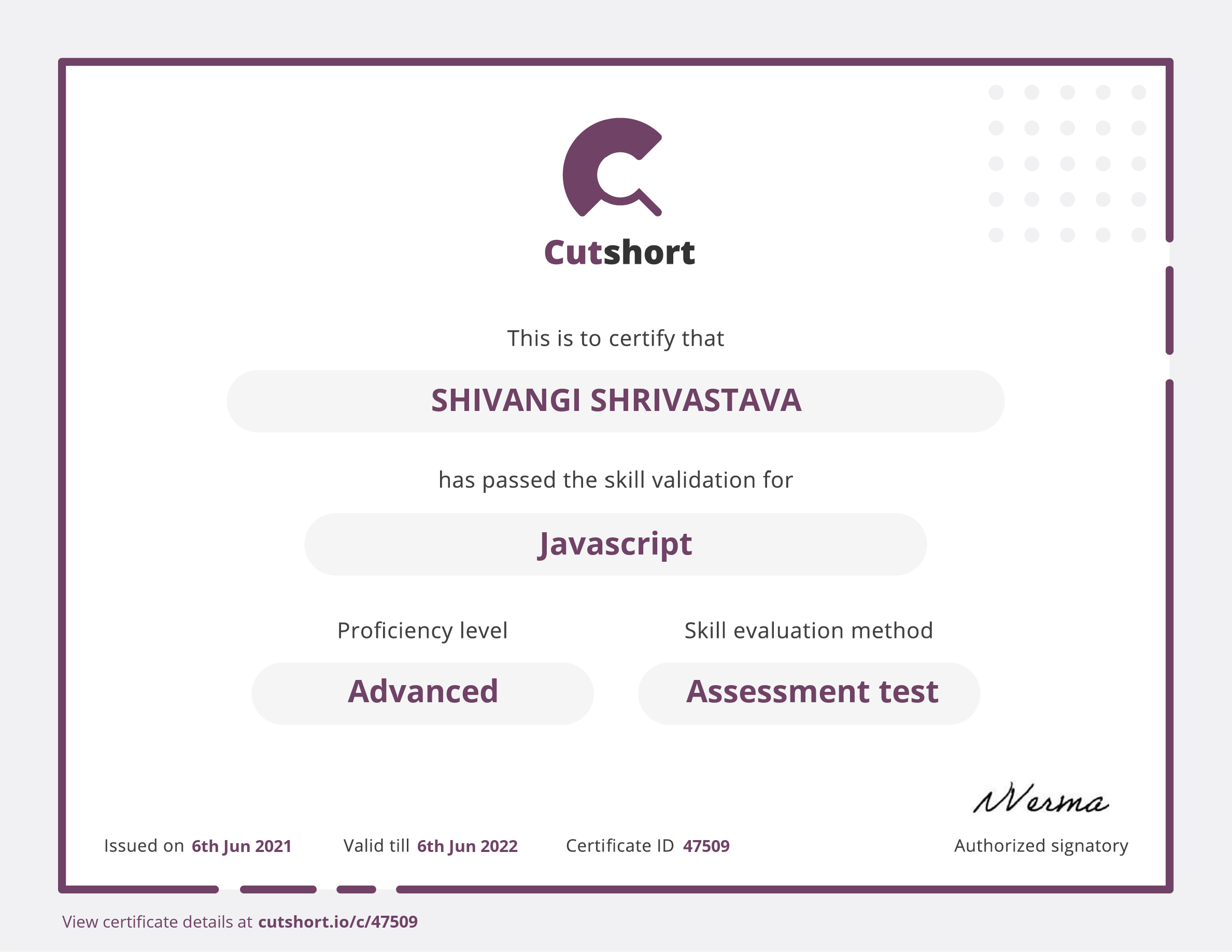 Presented to SHIVANGI for Advanced proficiency in Javascript
