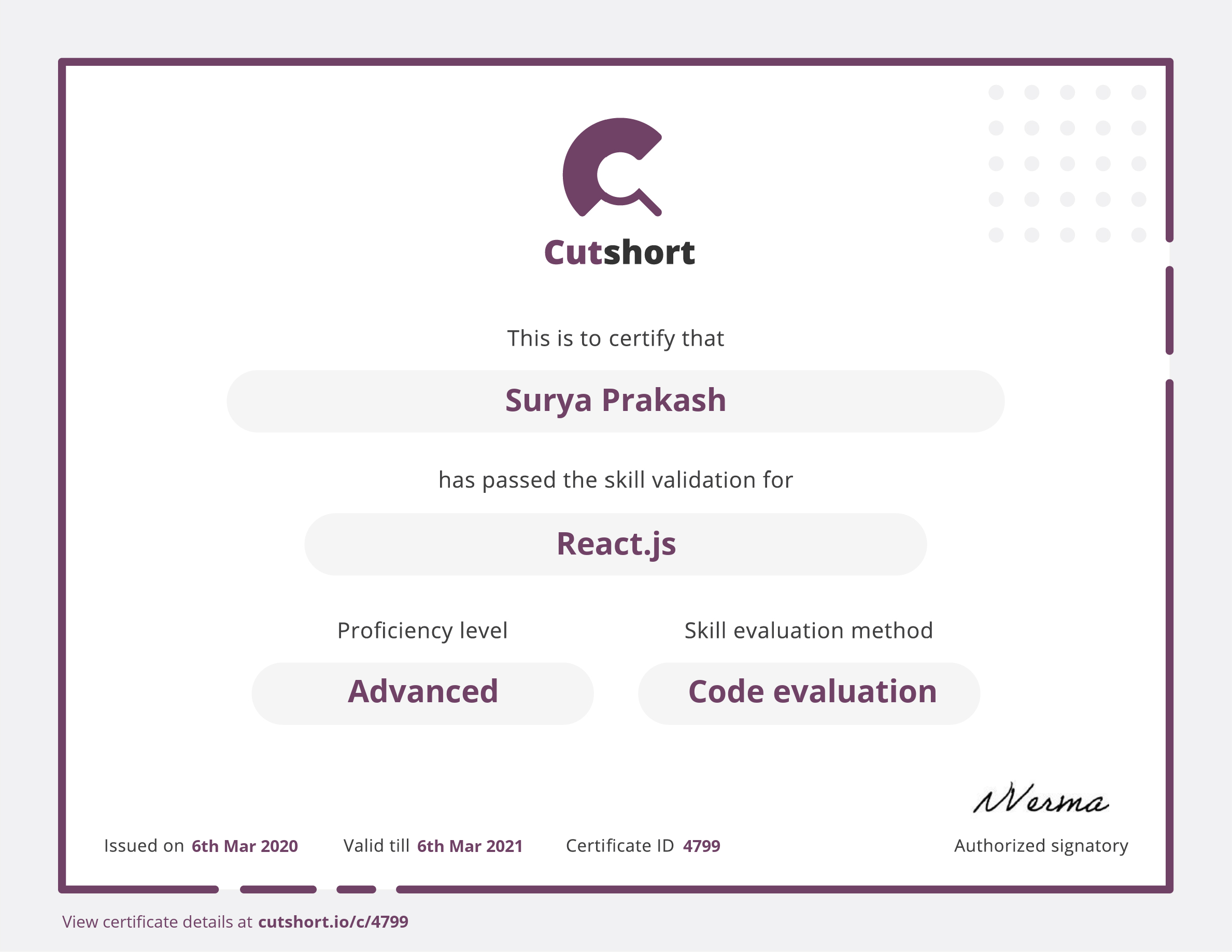 Presented to Surya for Advanced proficiency in React.js