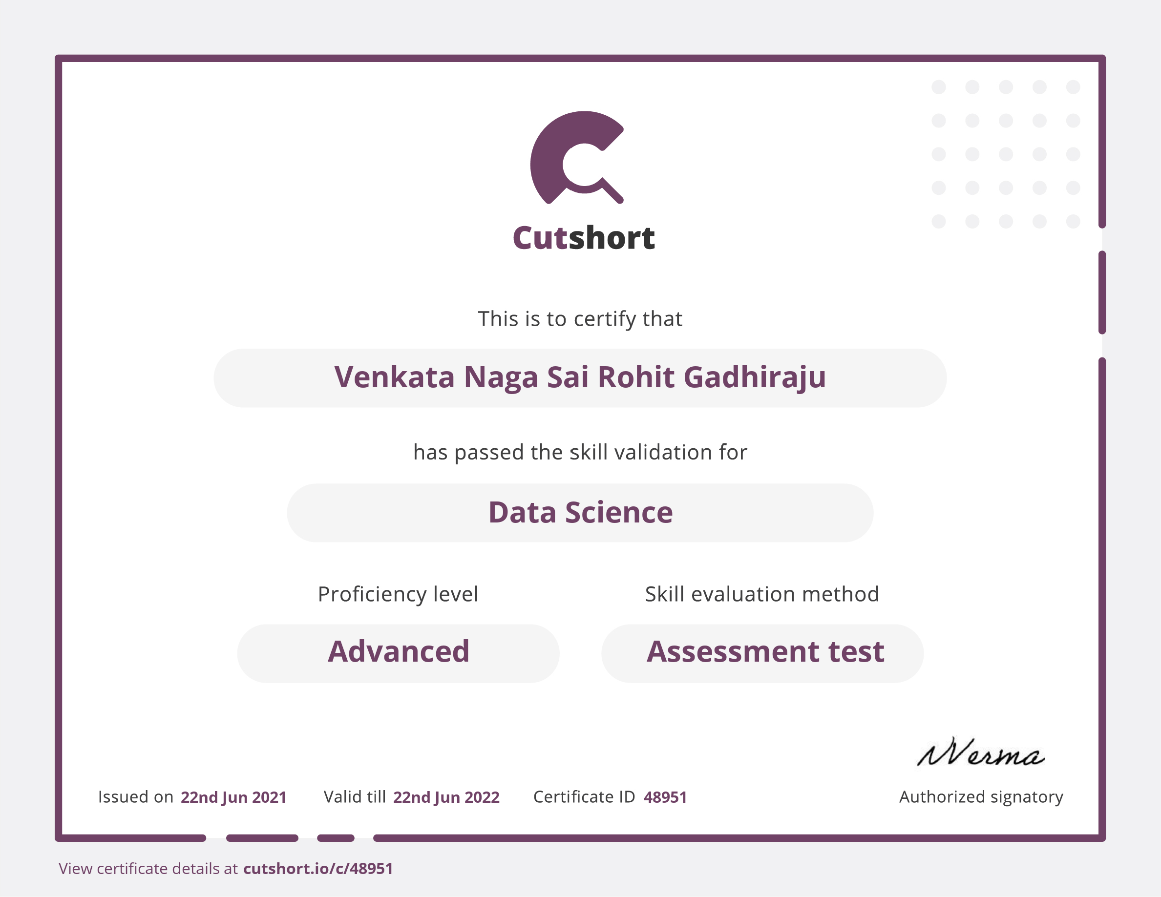 Cutshort skill certificate