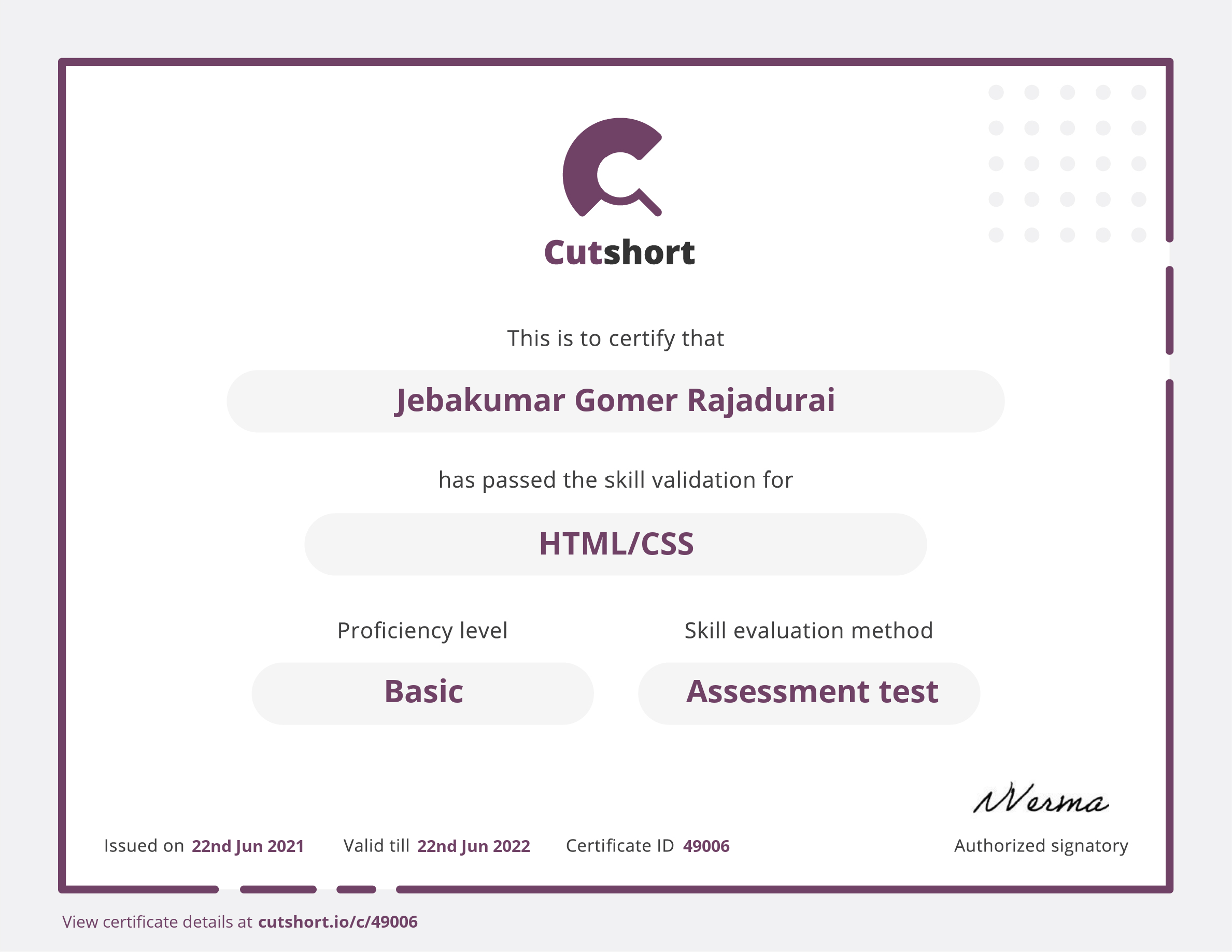 Presented to Jebakumar for Basic proficiency in HTML/CSS
