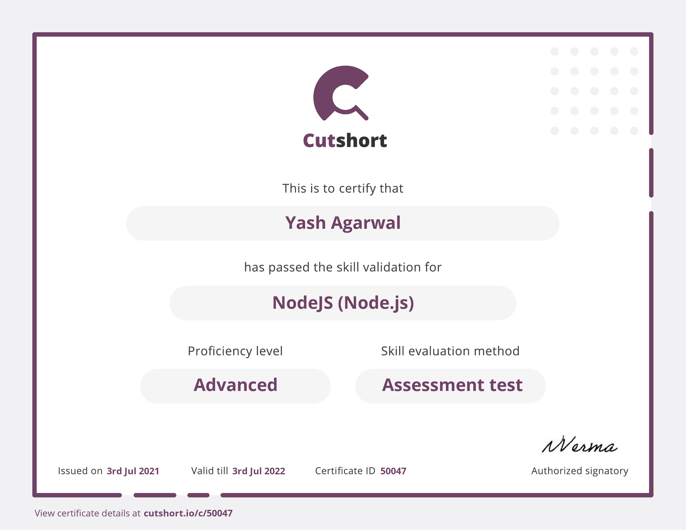 Presented to Yash for Advanced proficiency in NodeJS (Node.js)