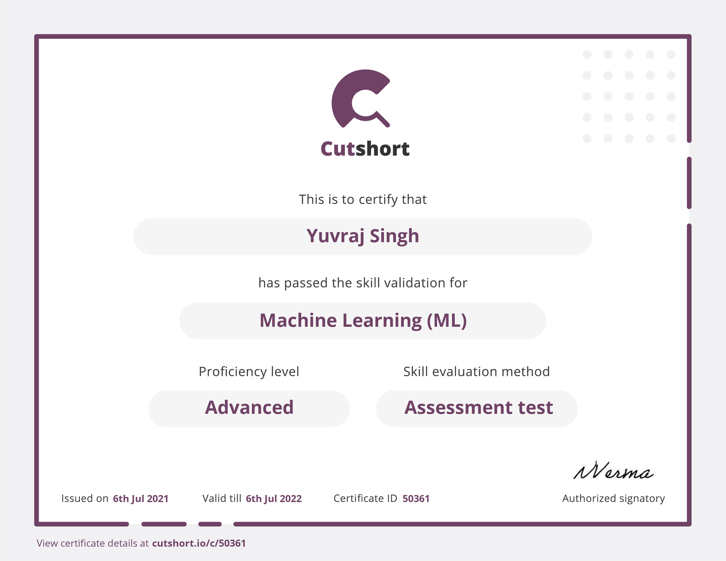 Presented to Yuvraj for Advanced proficiency in Machine Learning (ML)