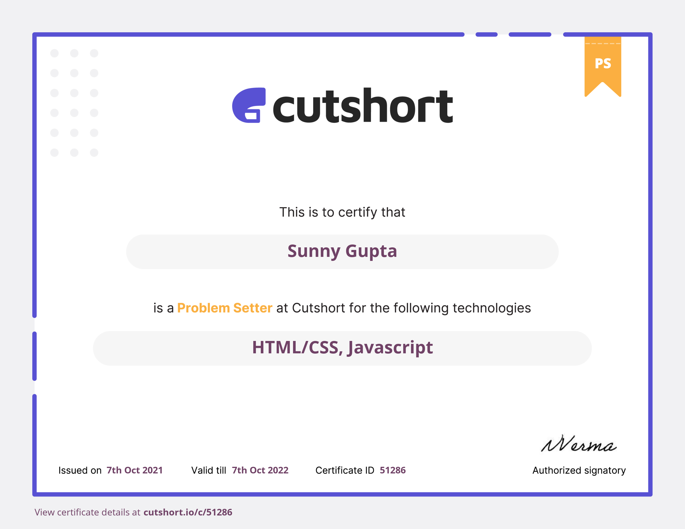 Cutshort problem setter certificate