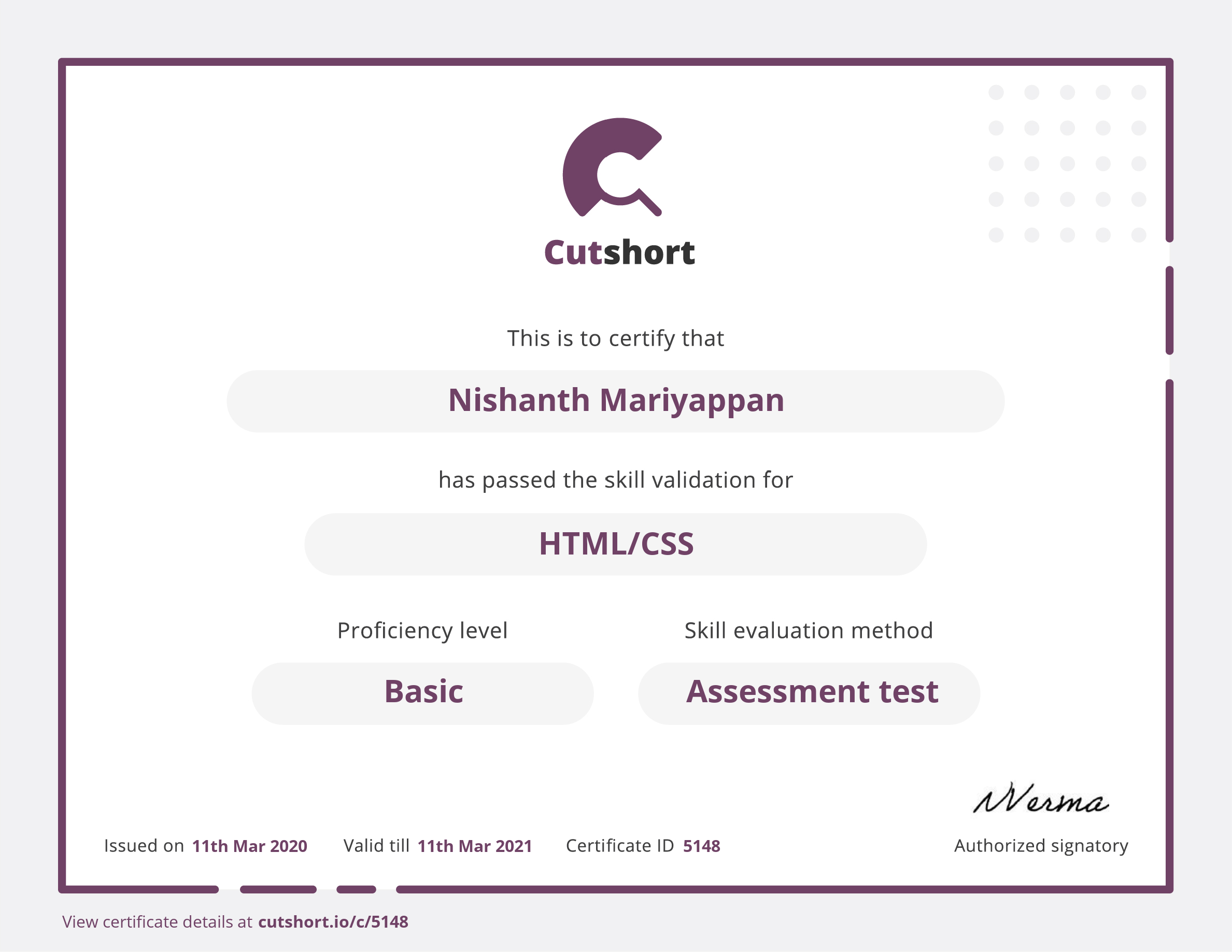 Cutshort skill certificate