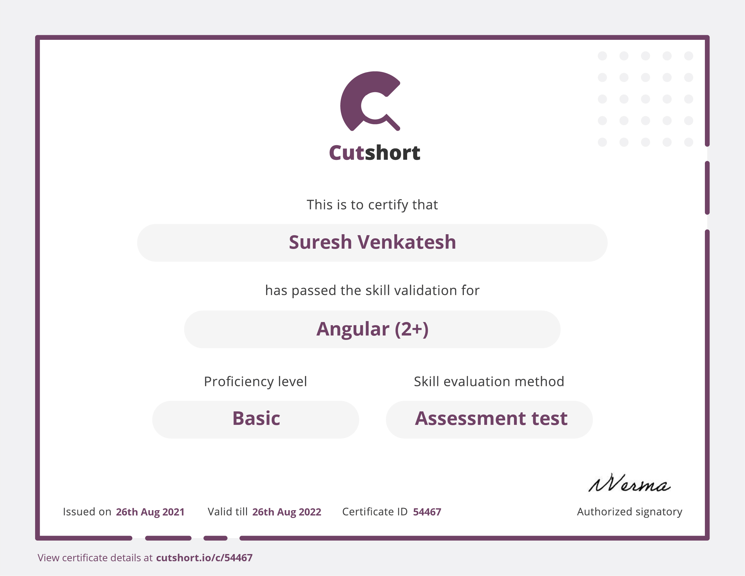 Presented to Suresh for Basic proficiency in Angular (2+)
