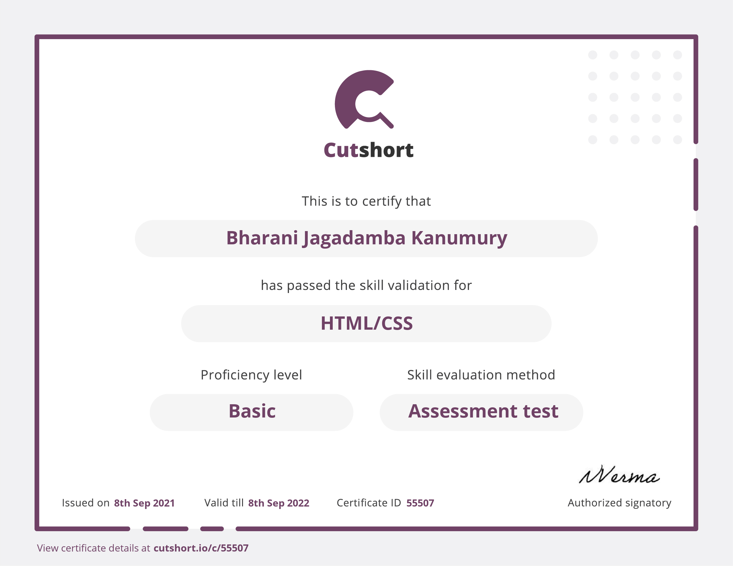 Presented to Bharani for Basic proficiency in HTML/CSS