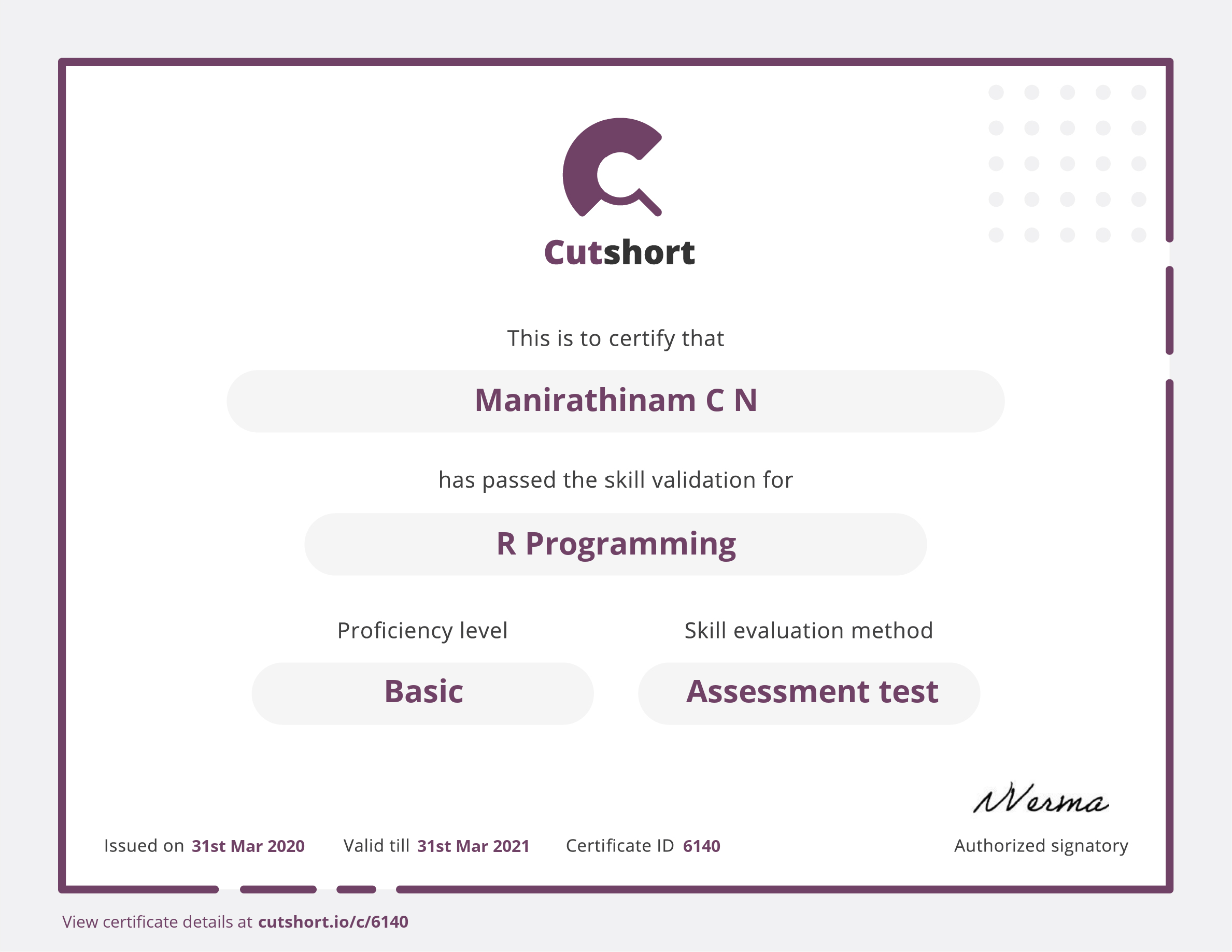 Presented to Manirathinam for Basic proficiency in R Programming