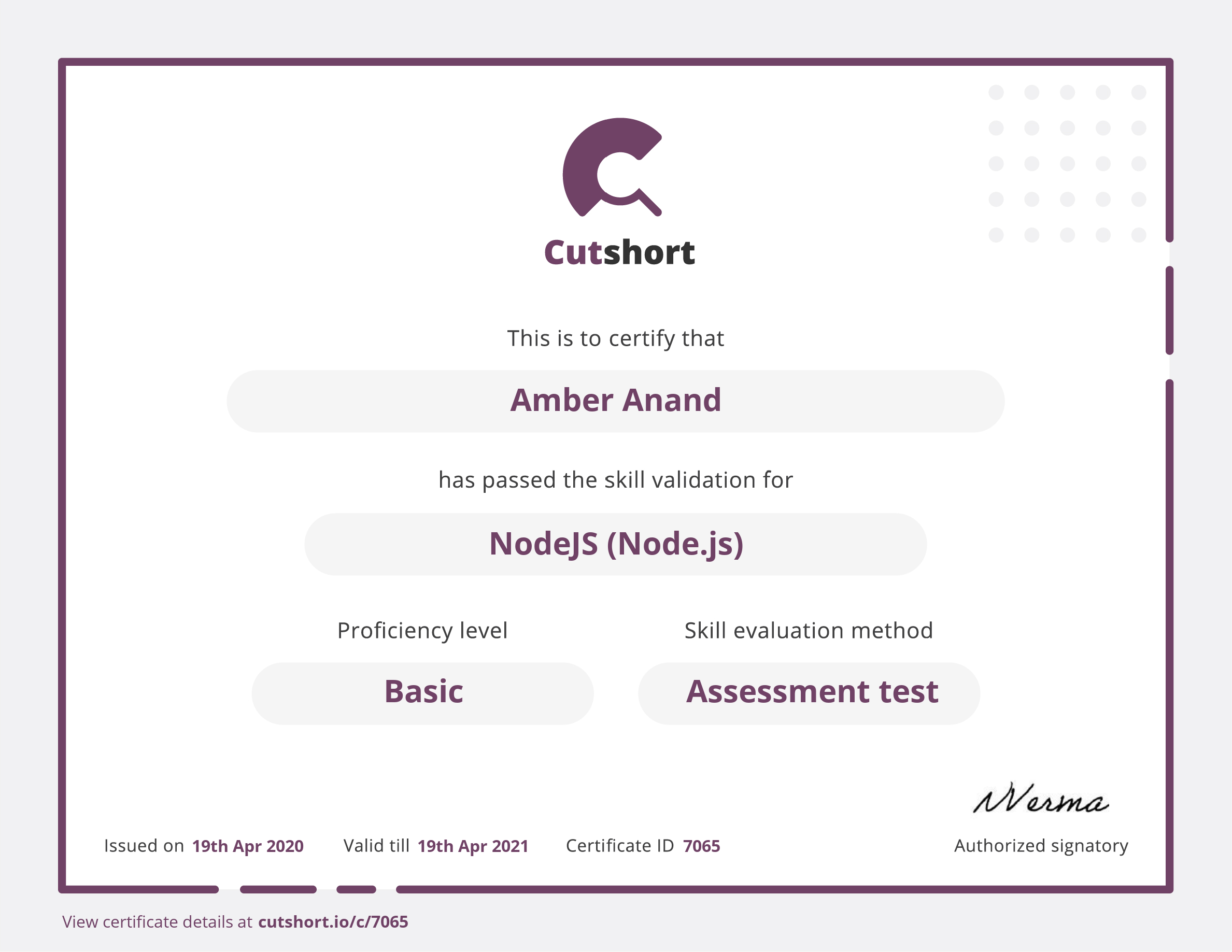 Presented to Amber for Basic proficiency in NodeJS (Node.js)