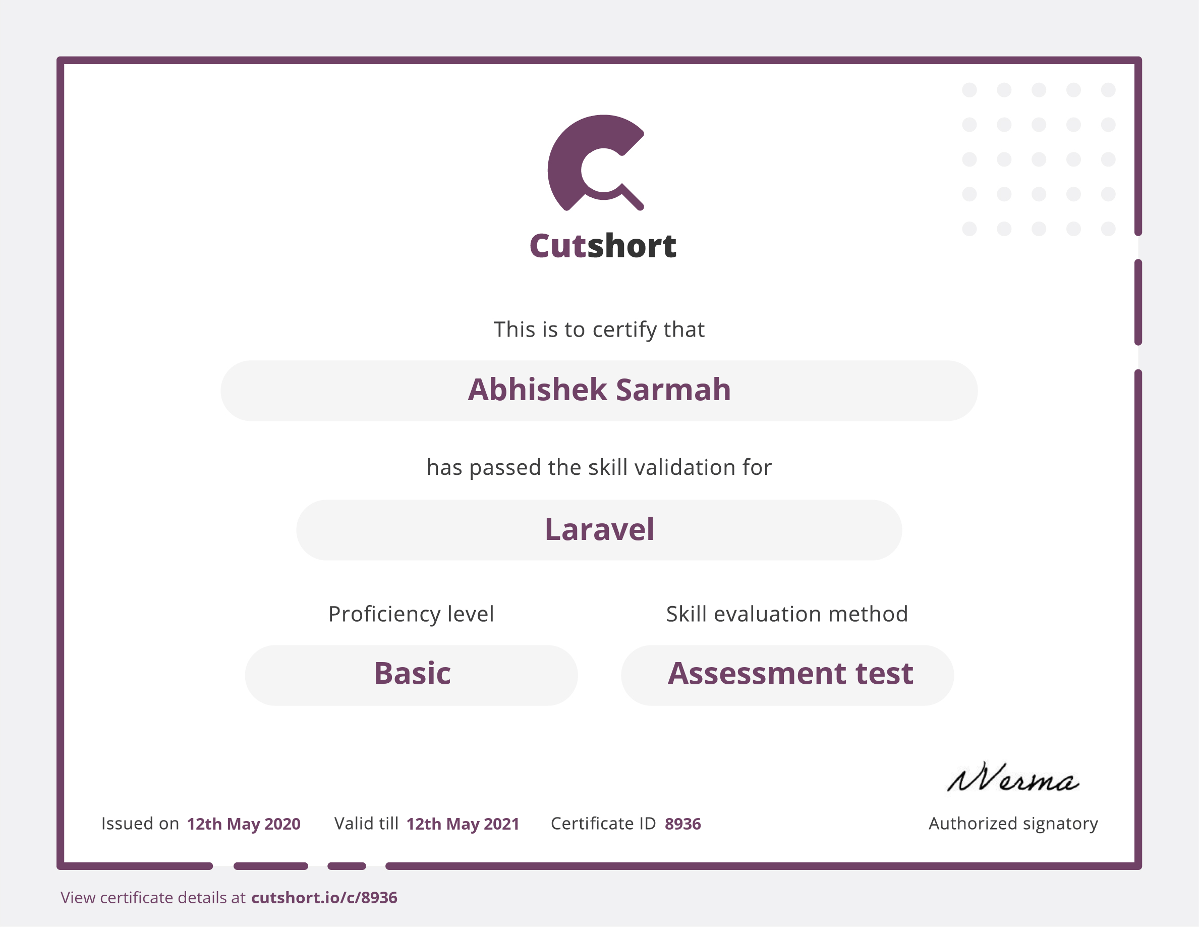 Presented to Abhishek for Basic proficiency in Laravel