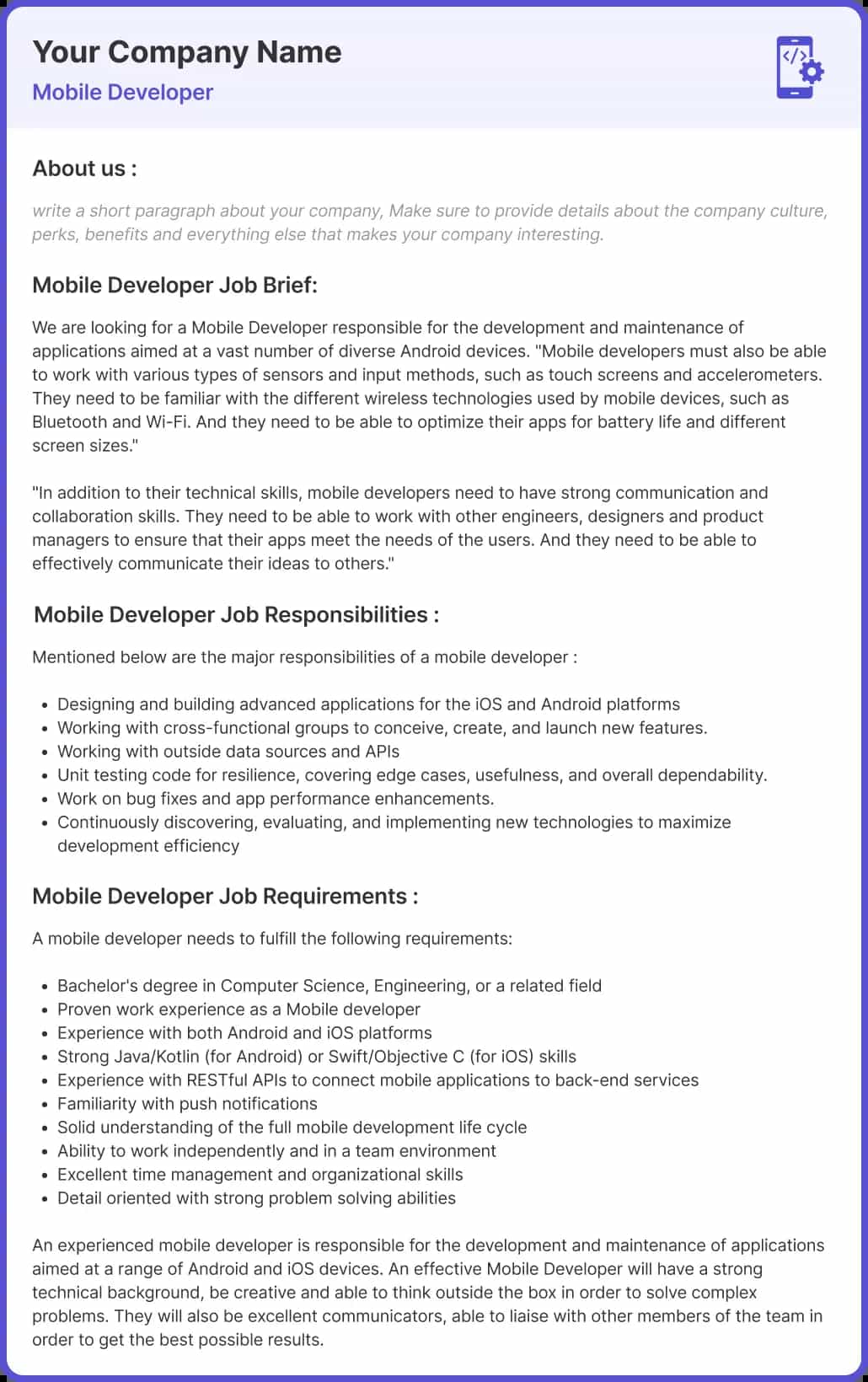 An experienced mobile developer is responsible for developing and maintaining applications aimed at a range of Android and iOS devices. An effective Mobile Developer will have a solid technical background, be creative, and be able to think outside the box to solve complex problems. They will also be excellent communicators, able to liaise with other team members to get the best possible results.